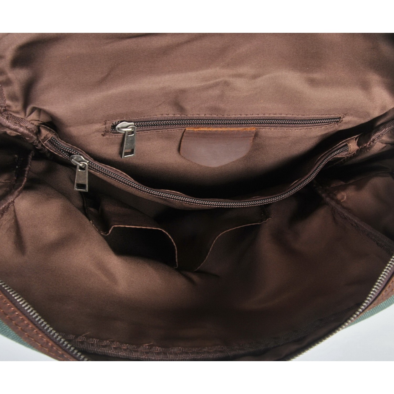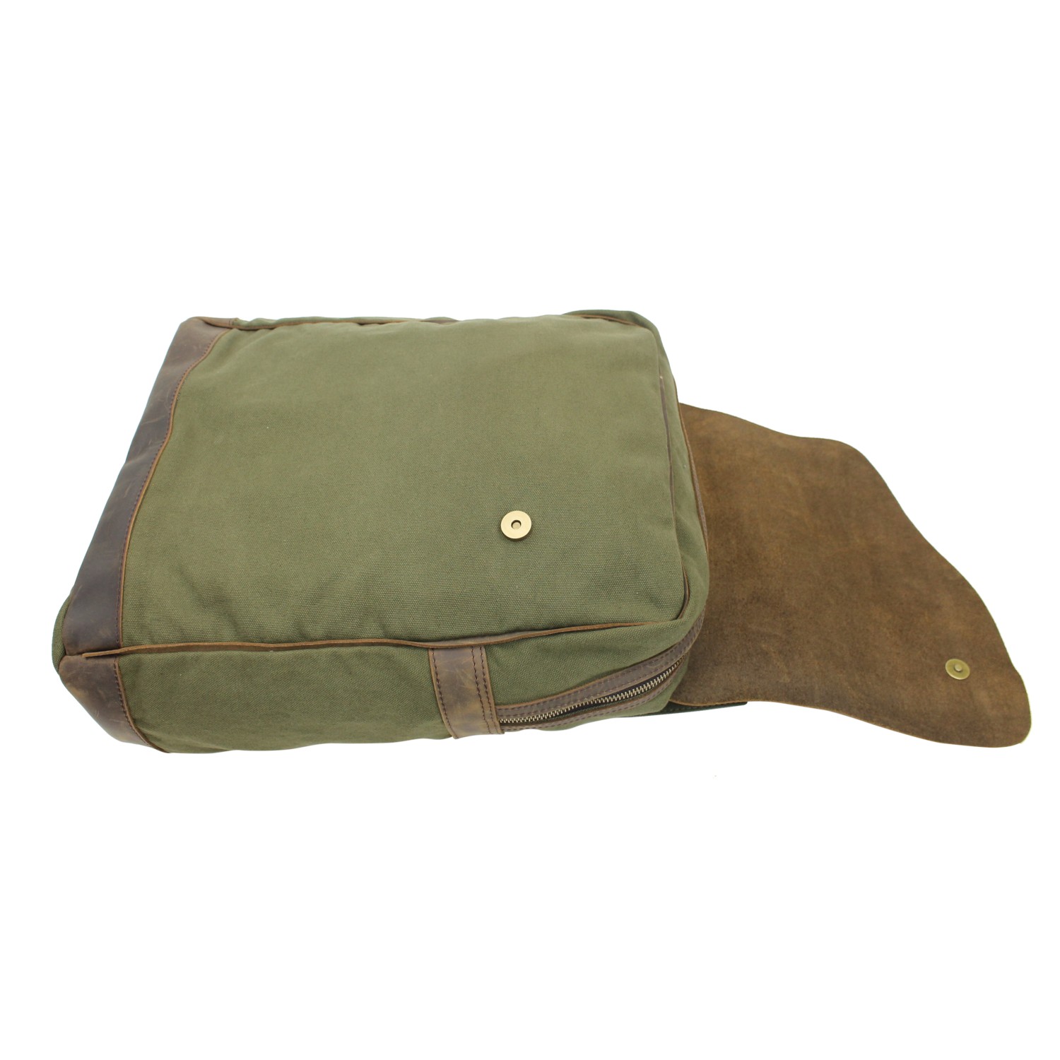Dimension: 16 * 13.5 * 5"; weight 2 lb 6 oz Top zipper access with cowhide flap over panel single button closure Top lift handle; zipper back pocket for extra storage Large internal back side zipper divider researved for laptop; internal phone and notebook holder Vintage brass fitting hardware;16oz durable thick canvas with reinforce material added